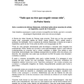 A Escola de Artes Visuais do Parque Lage apresentou “Tudo que tive que engolir nessa vida”, uma exposição inédita de Pedro Varela, com curadoria de Adriana Nakamuta. A mostra ocupou a Capelinha de 13 de junho a 11 de agosto de 2024.