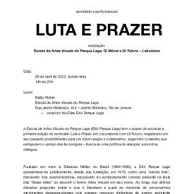 Videos do Seminário disponíveis no Youtube: SEMINÁRIO LUTA E PRAZER - 18h15 https://youtu.be/nqaVS2IT4YM / SEMINÁRIO LUTA E PRAZER - 17h https://youtu.be/_3_EUXUbV7M / SEMINÁRIO LUTA E PRAZER - 15h30 https://youtu.be/nEOF3sSEosg / SEMINÁRIO LUTA E PRAZER - 14h https://youtu.be/ZLmHOnZw12k