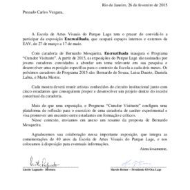 Coleção Lisette Lagnado (2014 - 2016) Item [Carta convite à Carol Valansi, para participar da exposição ‘Encruzilhada’] BREAVLL-0076 Baixar Metadados Título[Carta convite à Carol Valansi, para participar da exposição 'Encruzilhada']Número de RegistroBREAVLL-0076Série / SubsérieExposição > EAVFundoLisette LagnadoDatafevereiro 26, 2015Data e Local Rio de Janeiro; BrasilSuporteEletrônicoSetor / LocalExposiçãoEspécie DocumentalConviteCurador / OrganizadorBernardo MosqueiraParticipantesLisette Lagnado, Marcio Botner.FormaCópiaFormatoPDFCromiaPreto e Branco Continuar navegando [Carta convite à Cildo Meireles, para participar da exposição ‘Encruzilhada’] [Carta convite à Carlos Vergara, para participar da exposição ‘Encruzilhada’] Voltar para a lista de itens