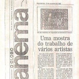 Coleção Luiz Áquila (1988-1991) Item [Convite da exposição dos trabalhos dos artistas do Ateliê Centro-Rio] LAQ-0380 Baixar Metadados Título[Convite da exposição dos trabalhos dos artistas do Ateliê Centro-Rio]DescriçãoConvite da exposição dos trabalhos dos artistas do ateliê Centro -Rio organizado pelo Gabinete de Gravura da EAV/Parque Lage, no período de 13 a 24 de novembro de 1990.Número de RegistroBREAVLAQ0038Série / SubsérieExposição > EAVFundoLuiz ÁquilaData e LocalRio de Janeiro; BrasilSuportePapelParticipantesClaudio Fonseca, Fernando Lopes, João Atanásio; Milton Rechtand; Ana Miguel e Armando Mattos.IndexaçãoConvite > exposição > Atelier Centro-Rio > Gabinete de GravuraGêneroIconográficoCatalogado - InventariadoCatalogadoArquivos RelacionadosConvite (BREAVLAQ0037); Clipping (BREAVLAQ0039)Descrição FísicaPapel cartão impresso na cor preta. Papel amarelecido no v. Perda do suporte e manchas de resíduo de fita adesiva.Quantidade e Dimensões01 item; 10,3 x 15,0 cmData Aproximada13-24/11/1990 Continuar navegando [Convite da exposição dos trabalhos dos artistas do Ateliê Centro-Rio] Uma mostra do trabalho de vários artistas [clipping da exposição do Ateliê Centro-Rio] Voltar para a lista de itens