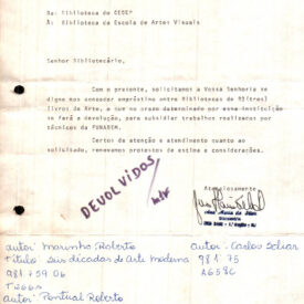 Coleção Marcus Lontra (1983-1987) Item [Correspondência sobre doação da obra “Arte no Brasil”] ML-0424 Baixar Metadados Título[Correspondência sobre doação da obra "Arte no Brasil"]Número de RegistroBREAVML0118Série / SubsérieGestão > AdministrativoFundoMarcus LontraDatafevereiro 4, 1984GêneroTextualCatalogado - InventariadoInventariadoProdutor[Mario Migino N. M. Leonel, Comunicações, Lazer, Cultura]DestinatárioMarcus Lontra, Diretor da Escola de Artes VisuaisQuantidade e Dimensões01 Item Continuar navegando [Correspondência sobre envio da publicação “CNAC MAGAZINE” solicitado ao Consulado General da França] [Correspondência sobre solicitação de empréstimo de três livros pela Fundação Nacional do Bem-Estar do Menor] Voltar para a lista de itens