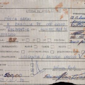 Folha de papel mimeografada e preenchida à caneta de cor azul. O papel encontra-se acidificado e amarelecido, com marcas e perfurações de grampos de metal, perfurações provenientes de térmitas no CSD e manchas no CID.