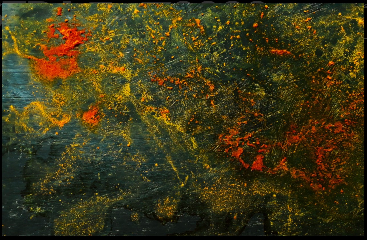 1 - Chapa Luíza Moreira Bittencourt 2020 Experiências com pigmentação natural e diluentes Especiarias diversas sobre tela Cúrcuma sobre papelão -